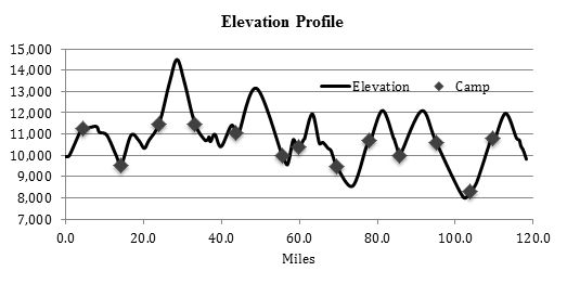 | Location | Daily Distance | Cumulative Distance | Elevation |