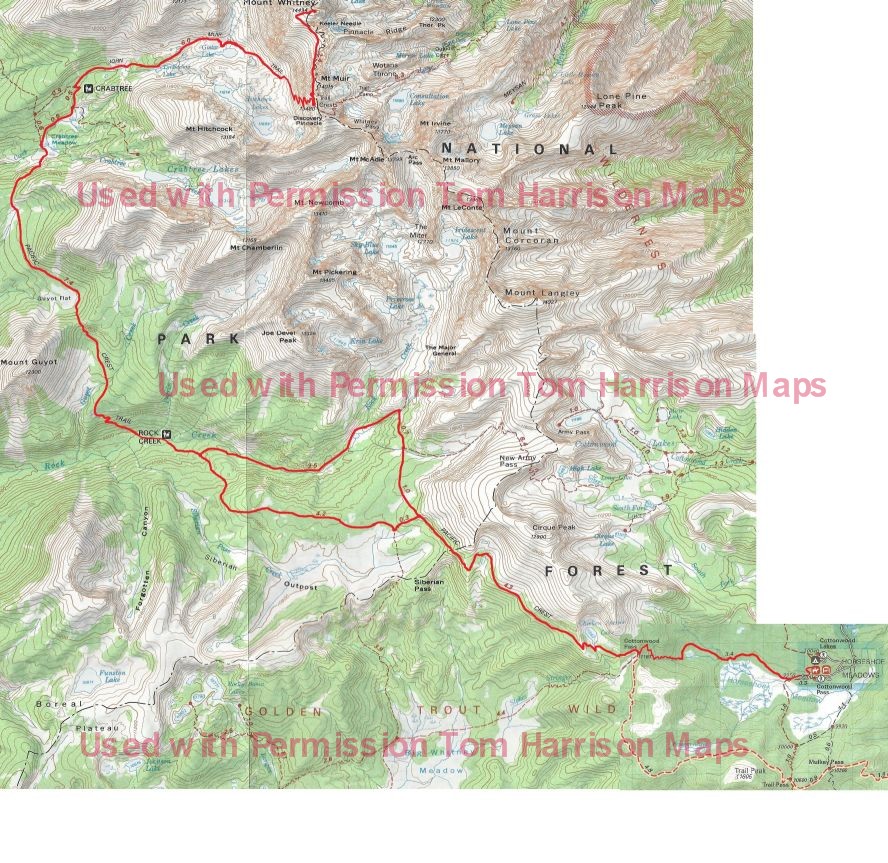 The day starts with a steady climb out of the Rock Creek drainage to Guyot Pass, 1,400 in 2.5 miles. Dropping down from the pass, the path traverses the hillside on a sandy trail. Twisted foxtail pines frame views of Red Spur across the Kern Canyon. There is a brief climb into the Whitney Creek drainage, before the trail drops 400 to the Whitney junction near the creek, which is about six miles from our camp. Turn onto the trail to Whitney, following Whitney Creek and passing the ranger station before joining the John Muir Trail in 1.1 miles. Turn up the canyon toward Mount Whitney, passing out of the trees at Timberline Lake and finally stopping at our camp above Guitar Lake. Mount Whitney towers 3,000 above us to the east.